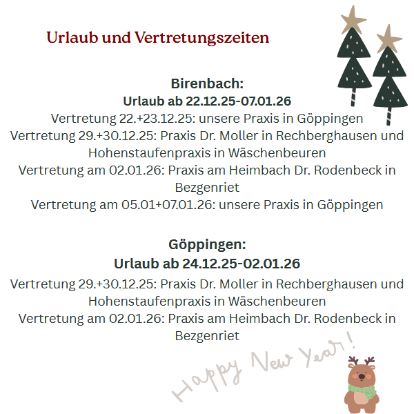 Mit unserer allgemeinmedizinischen Praxis in Birenbach und Göppingen stellen wir Ihnen unser gesamtes Leistungsspektrum der hausärztlichen Versorgung zur Verfügung und freuen uns auf Ihren Besuch.